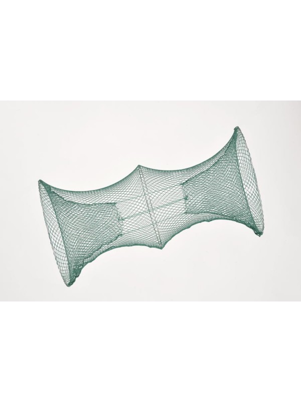 Reuse aus knotenlosem Polyamid (Nylon), 90 cm Ø, 20 mm Maschenweite, 3 Reifen aus Edelstahl und zwei Eingänge.